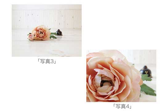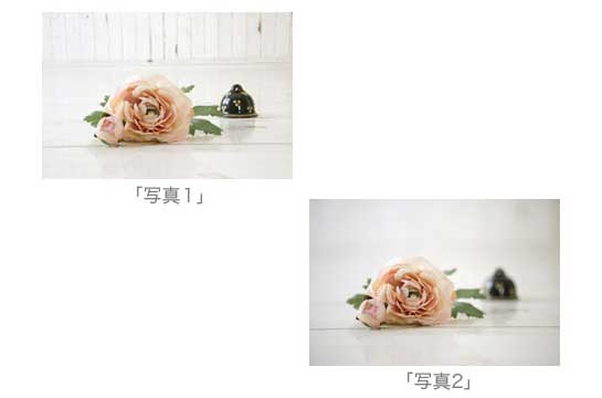 下の2枚の写真はデジタル一眼を使って撮影しました。レンズは70mmです。バラと鈴の前後の距離は約20cmです。「写真1」は「絞り値」を最大限に絞り込んでバラにピントを合わせて撮影しました。背景はあまりぼけた写真になっていません。