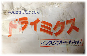 砂利の上にレンガを載せただけでは基礎を固めたことにはなりません。今度はその周りをモルタルで固めます。コンクリート化させて固定するわけですね。プロの方はセメントと砂を調合してモルタルを作りますが、素人の私にも簡単にできるモルタルが安価で売っています。「ドライミクス」というインスタントモルタルは20kgで500円弱ですので愛用しています。